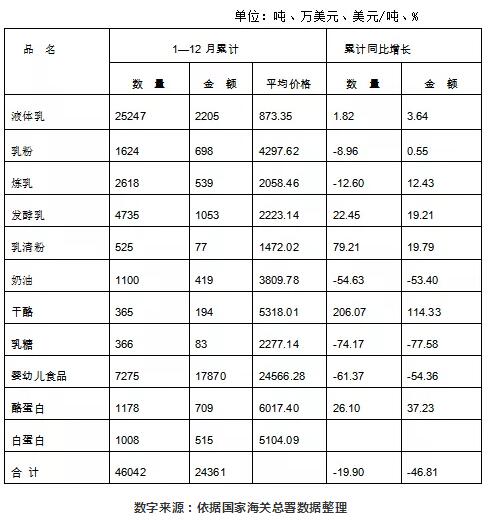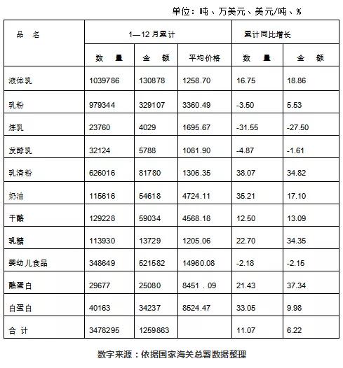 1、進口。據(jù)海關(guān)統(tǒng)計數(shù)據(jù),2020年1-12月全國共進口各種乳制品347.83萬噸,金額125.99億美元,同比分別增長11.07%和6.22%。進口乳制品總貨值約為1026.2億元人民幣,相當于國內(nèi)乳制品工業(yè)銷售總收入的24.5%;折合成鮮奶約1943.7萬噸,相當于國內(nèi)生鮮乳產(chǎn)量的60%。其中,液體乳進口量增長16.75%、乳粉增長-3.50%、嬰幼兒配方乳粉增長-2.18%、乳清粉增長38.07%、乳糖增長22.70%,幅度最大,但我認為是企業(yè)原料儲備的原因。各品種乳制品進口情況如下:
