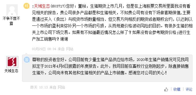 天域生態(tài)3月31日回復(fù)投資者提問(wèn)時(shí)表示,公司目前有少量生豬產(chǎn)品供應(yīng)給市場(chǎng),2020年生豬產(chǎn)銷(xiāo)情況可見(jiàn)我司擬定于2021年4月6日披露的年度報(bào)告。此外,我司目前在畜牧行業(yè)剛剛起步,除直接銷(xiāo)售生豬外,公司尚未有其他和生豬相關(guān)的產(chǎn)品上市銷(xiāo)售。