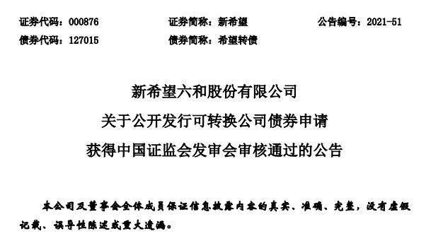 新希望4月6日晚間發(fā)布公告稱,2021年4月6日,中國證券監(jiān)督管理委員會發(fā)行審核委員會2021年第38次工作會議對新希望六和股份有限公司公開發(fā)行可轉(zhuǎn)換公司債券的申請進行了審核。根據(jù)審核結(jié)果,公司本次公開發(fā)行可轉(zhuǎn)換公司債券申請獲得通過。
