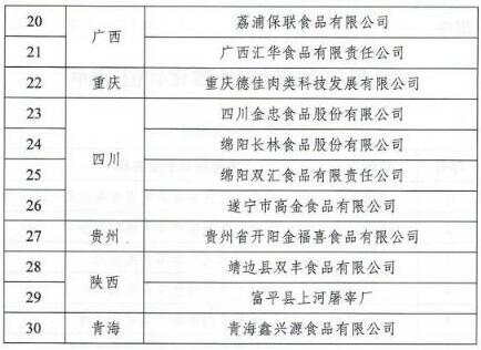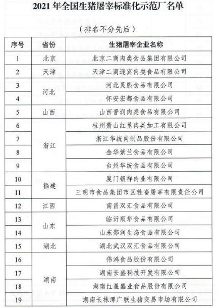按照質(zhì)量管理制度化、廠區(qū)環(huán)境整潔化、設(shè)施設(shè)備標(biāo)準(zhǔn)化、生產(chǎn)經(jīng)營規(guī)范化、檢測(cè)檢驗(yàn)科學(xué)化、排放處理無害化的總體要求,農(nóng)業(yè)農(nóng)村部確定北京二商肉類食品集團(tuán)有限公司等30家企業(yè)為全國生豬屠宰標(biāo)準(zhǔn)化示范廠并頒發(fā)標(biāo)牌。