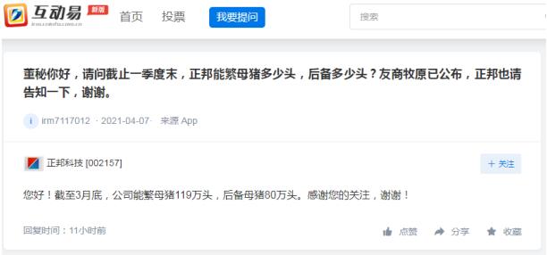 正邦科技:截至3月底,公司能繁母豬119萬頭,后備母豬80萬頭