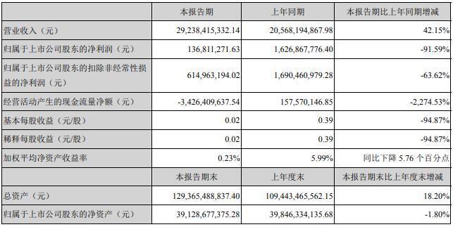 新希望4月30日發(fā)布一季度業(yè)績(jī)公告。2021年第一季度營(yíng)收約292.38億元,同比增長(zhǎng)42.15%;凈利潤(rùn)約1.37億元,同比下降91.59%;基本每股收益0.02元,同比下降94.87%。
