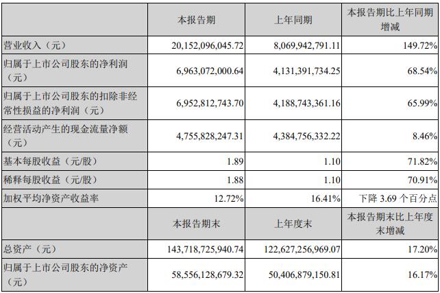 牧原股份4月30日發(fā)布2021年第一季度報(bào)告。公司實(shí)現(xiàn)營(yíng)業(yè)收入201.52億元,同比增長(zhǎng)149.72%;歸屬于上市公司股東的凈利潤(rùn)69.63億元,同比增長(zhǎng)68.54%;基本每股收益1.89元。