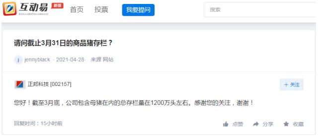 正邦科技5日在回復投資者提問時表示,截至3月底,公司包含母豬在內的總存欄量在1200萬頭左右。