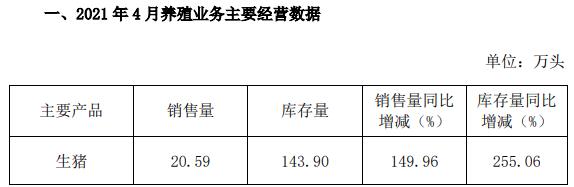 2021年1-4月,公司累計(jì)銷售生豬74.05萬(wàn)頭,銷售量同比增長(zhǎng)170.19%。