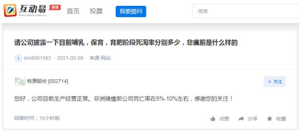 5月11日,牧原股份在回復(fù)投資者提問(wèn)時(shí)表示:公司目前生產(chǎn)經(jīng)營(yíng)正常。非洲豬瘟前公司死亡率在8%-10%左右。