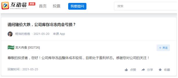 龍大肉食:公司庫(kù)存凍品整體成本較低,目前處于盈利狀態(tài)