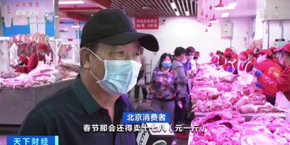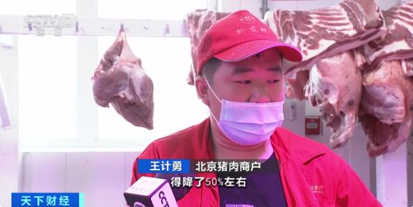 北京豬肉商戶 王計勇:比上個月一斤便宜兩三元錢,和去年同期相比的話,得降了50%左右吧。