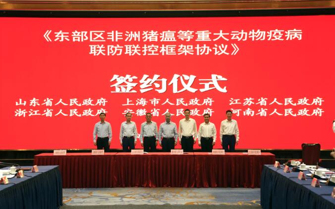 6月2日,東部區(qū)非洲豬瘟等重大動物疫病分區(qū)防控首次聯(lián)席會議在山東省濟南市召開,山東、上海、江蘇、浙江、安徽、河南等6省市共同簽署《東部區(qū)非洲豬瘟等重大動物疫病聯(lián)防聯(lián)控框架協(xié)議》。會議強調,要深入貫徹中央領導同志重要指示批示精神,認真落實農業(yè)農村部印發(fā)的《非洲豬瘟等重大動物疫病分區(qū)防控工作方案(試行)》,以更大的決心、更扎實的舉措,推進非洲豬瘟分區(qū)防控各項措施落地見效。農業(yè)農村部副部長馬有祥出席會議并講話,山東省副省長汲斌昌、浙江省副省長劉小濤、安徽省副省長張曙光、河南省副省長武國定等出席會議。
