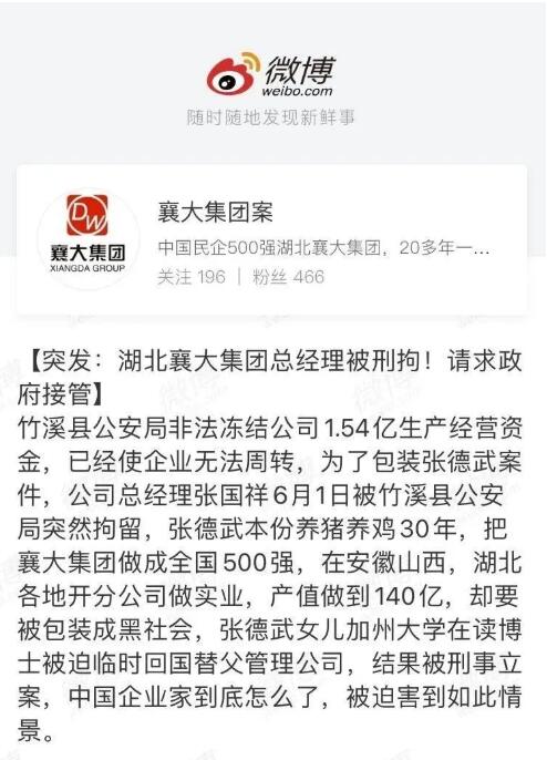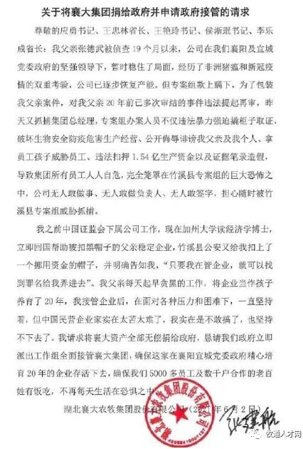 張建航在6月2日的集團公開文件中說道:中國民營企業(yè)家實在太苦太難了,自己不敢也堅持不下去了。請求將襄大資產(chǎn)全部無償捐給政府,懇求政府全面接管。