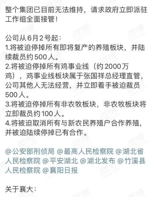 將被迫停掉所有雞事業(yè)線(約2000萬雞),雞事業(yè)線板塊屬于張國祥總經(jīng)理直管,公司其他人無法經(jīng)營,并立即著手被迫裁員500人;
