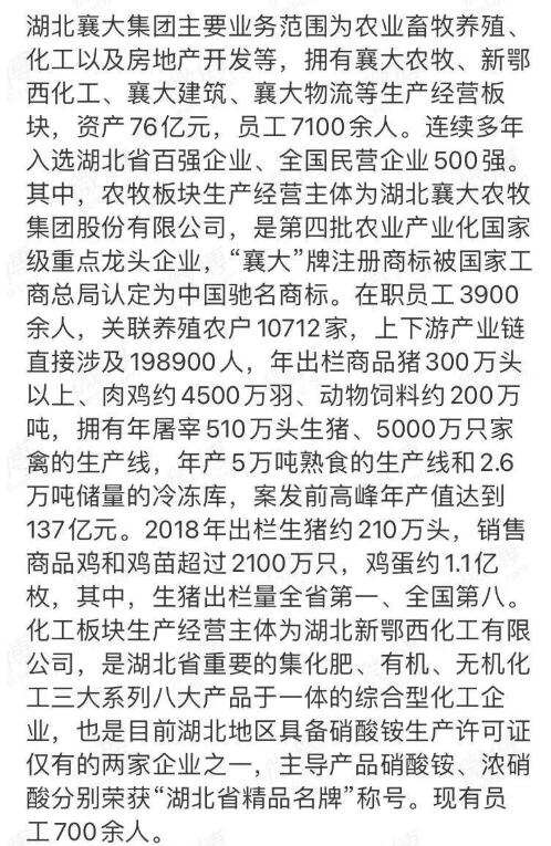案發(fā)前,襄大農(nóng)牧年產(chǎn)值達到137億元,年出欄生豬300萬頭以上。湖北省生豬養(yǎng)殖量排名第一的農(nóng)牧企業(yè)。