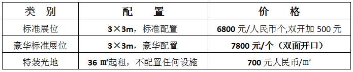 標(biāo)展配置:一張洽談桌、兩把椅子、三面白色圍板、參展企業(yè)門(mén)楣、5A/220V電源及插座一個(gè)。