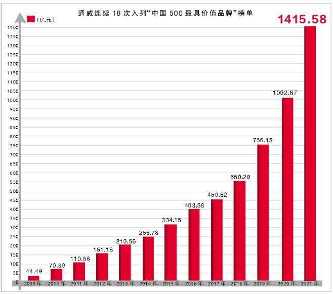 回溯通威品牌價值躍升之路,2004年通威品牌價值僅為19億元,到2011年邁上百億臺階,2012年一舉突破150億大關(guān),2015年實現(xiàn)品牌價值334億元,2017年、2018年相繼突破450億元、550億大關(guān),2019年實現(xiàn)品牌價值756億元,2020年成功突破1002.67億元大關(guān)。2021年,通威連續(xù)第18年入選中國品牌國家隊行列,品牌價值達1415.58億元,在千億新起點上繼續(xù)實現(xiàn)高質(zhì)量發(fā)展。