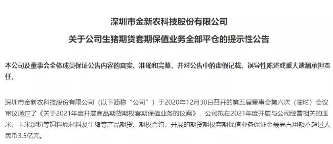 4月27日,金新農(nóng)曾發(fā)布提示性公告稱,公司期貨決策小組及財(cái)務(wù)部門的初步測算,截至2021年3月31日,公司開展的生豬期貨套期保值業(yè)務(wù)的虧損累計(jì)13099.44萬元,其中浮動(dòng)虧損3083.87萬元,平倉虧損10015.57萬元。金新農(nóng)在公告中解釋形成虧損的主要原因是,公司期貨決策小組基于公司2021年度生豬生產(chǎn)能力及行業(yè)生豬產(chǎn)能的恢復(fù)程度,對未來生豬現(xiàn)貨市場價(jià)格作出的判斷而建立的生豬期貨套期保值合約。春節(jié)后生豬現(xiàn)貨市場價(jià)格快速回落,現(xiàn)貨價(jià)格與期貨價(jià)格基差由升水變?yōu)橘N水,生豬期現(xiàn)價(jià)格偏離度較大,生豬期貨價(jià)格階段性的快速上漲導(dǎo)致公司生豬期貨套期保值業(yè)務(wù)出現(xiàn)虧損。