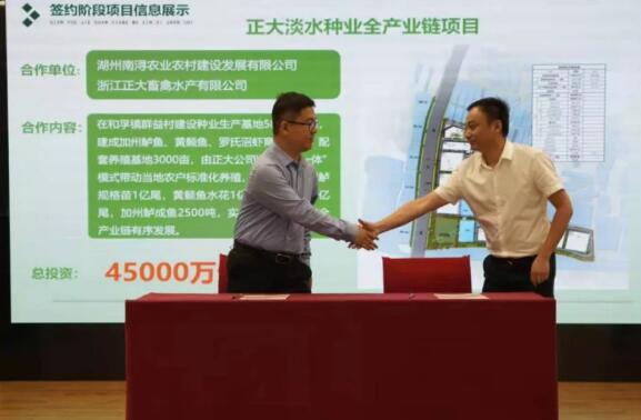 湖州市南潯區(qū)副區(qū)長(zhǎng)秦勝在致辭中表示,對(duì)正大集團(tuán)等企業(yè)的投資表示歡迎,并表示會(huì)為企業(yè)提供良好的投資環(huán)境,也希望新項(xiàng)目能夠加快進(jìn)度,快速落地。正大集團(tuán)農(nóng)牧食品企業(yè)中國(guó)區(qū)副董事長(zhǎng)王慶軍則表示,此次正大集團(tuán)與南潯區(qū)政府?dāng)y手共建淡水種業(yè)及配套養(yǎng)殖全產(chǎn)業(yè)鏈項(xiàng)目,不僅是看中了南潯源遠(yuǎn)流長(zhǎng)的漁業(yè)文化、基礎(chǔ)雄厚的漁業(yè)產(chǎn)業(yè),得天獨(dú)厚的區(qū)位優(yōu)勢(shì),更是想通過(guò)項(xiàng)目共建,打造高效漁業(yè)、綠色漁業(yè),真正推動(dòng)湖州、浙江乃至長(zhǎng)三角地區(qū)的漁業(yè)發(fā)展與轉(zhuǎn)型升級(jí)。此次項(xiàng)目將采用“五位一體”合作模式,即:正大+政府+銀行+村集體+農(nóng)戶(hù),力爭(zhēng)共同打造國(guó)內(nèi)一流的淡水種業(yè)及配套養(yǎng)殖園區(qū),推動(dòng)長(zhǎng)三角水產(chǎn)養(yǎng)殖的發(fā)展。項(xiàng)目將在帶動(dòng)農(nóng)民增產(chǎn)增收,促進(jìn)地方經(jīng)濟(jì)高質(zhì)量發(fā)展、提高先進(jìn)工藝與設(shè)施實(shí)現(xiàn)生態(tài)水產(chǎn)養(yǎng)殖、推動(dòng)行業(yè)的全產(chǎn)業(yè)鏈發(fā)展、促進(jìn)行業(yè)數(shù)字化改革與轉(zhuǎn)型升級(jí)等方面發(fā)揮顯著作用。