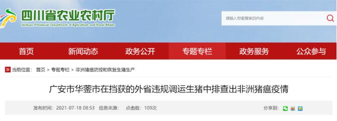 7月17日,四川省農(nóng)業(yè)農(nóng)村廳接到四川省動物疫病預防控制中心報告,經(jīng)四川省動物疫病預防控制中心實驗室確診,在華鎣市天池高速公路出口擋獲的一車外省違規(guī)調(diào)運仔豬送檢樣品中檢測出非洲豬瘟病毒核酸陽性。擋獲時,該車共載有仔豬89頭,死亡1頭。