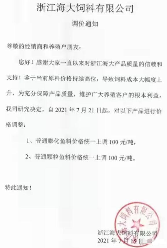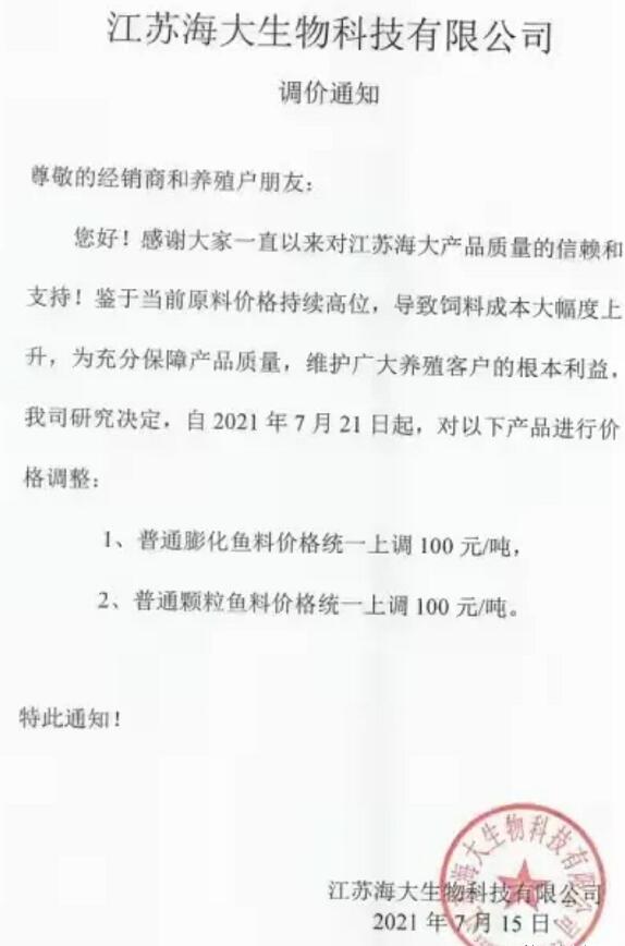 21日起,江蘇海大、浙江海大宣布膨化魚料、顆粒魚料分別上調(diào)100元/噸。