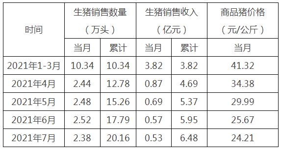 2021年7月份,公司商品豬銷售均價(jià)24.21元/公斤,其中:供港活大豬均價(jià)25.12元/公斤、內(nèi)銷商品肉豬均價(jià)15.45元/公斤。