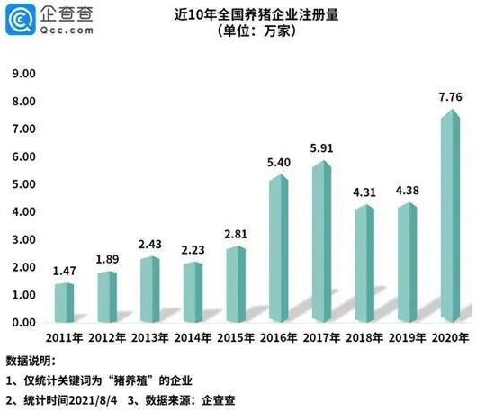 豬肉是我國(guó)居民肉食的主要來(lái)源,在我國(guó)居民的膳食結(jié)構(gòu)中扮演著重要角色,我國(guó)是世界豬肉消費(fèi)第一大國(guó),也是第一大豬肉生產(chǎn)國(guó)。2010-2015年全國(guó)養(yǎng)豬企業(yè)年均注冊(cè)量達(dá)2.17萬(wàn)家,2016年增長(zhǎng)率是近10年來(lái)最高的,同比增長(zhǎng)92%,注冊(cè)量達(dá)5.4萬(wàn)家。2020年注冊(cè)量是近10年最高的,共新增7.76萬(wàn)家,同比增長(zhǎng)77%。