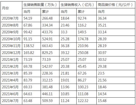 新希望8月9日公布2021年7月生豬銷售情況簡報。公司2021年7月銷售生豬63.48萬頭,環(huán)比變動-1.78%,同比變動17.14%;收入為11.24億元,環(huán)比變動3.59%,同比變動-39.70%;商品豬銷售均價15.48元/公斤,環(huán)比變動6.46%,同比變動-57.40%。