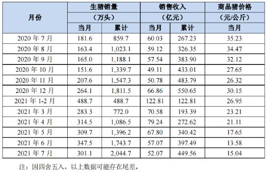 2021年7月份,公司商品豬銷售均價15.04元/公斤,比2021年6月份上漲10.75%。