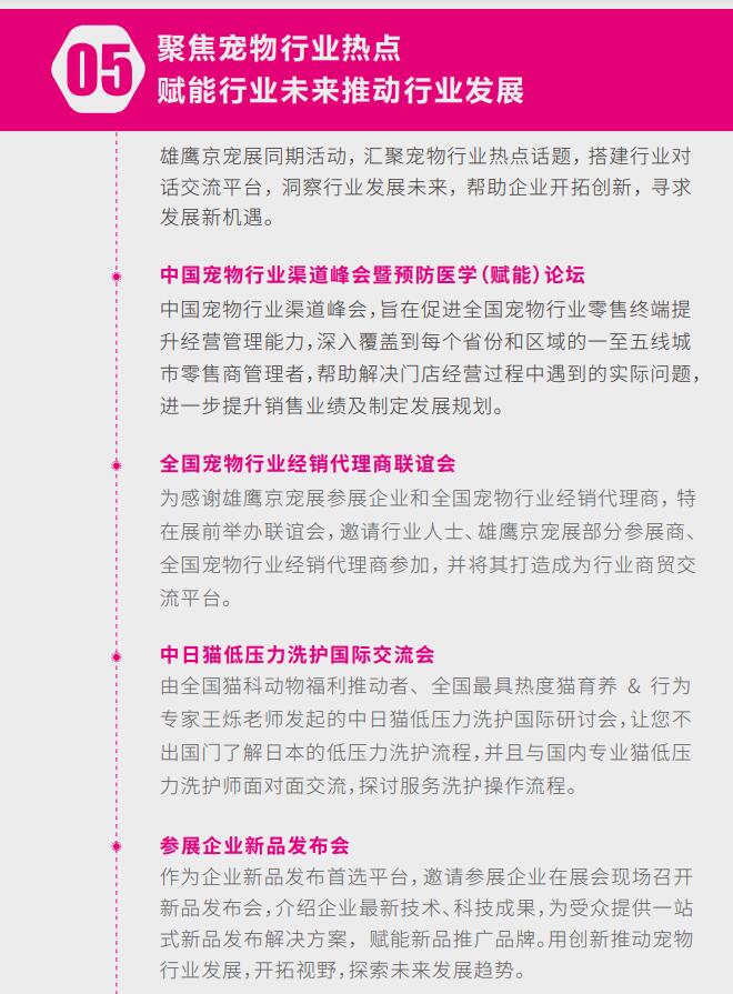 雄鷹京寵展匯聚全國行業(yè)精英,涵蓋國內(nèi)外的寵物用品全系列產(chǎn)品和前沿技術,是行業(yè)品牌推廣、新品發(fā)布、市場開拓、商務貿(mào)易、數(shù)據(jù)發(fā)布的專業(yè)化平臺,已成為行業(yè)發(fā)展趨勢的風向標。