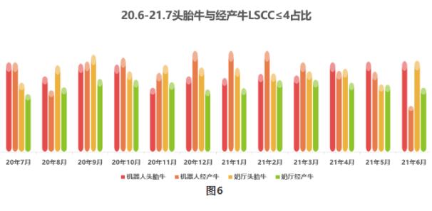 通過頭胎牛與經(jīng)產(chǎn)牛體細胞數(shù)對比,如圖5所示,除了5、6月份機器人擠奶個別牛體細胞數(shù)過高,從其它月份來看,不管頭胎牛還是經(jīng)產(chǎn)牛,機器人擠奶的體細胞數(shù)相對奶廳擠奶更低一些。表明機器人擠奶能夠給奶牛帶來更好的乳房健康程度。