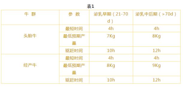 VMS系統(tǒng)能力可承受泌乳牛55-75頭。從表1可以看到,泌乳早期,頭胎牛最低預期產(chǎn)量7公斤左右,經(jīng)產(chǎn)牛最低預期產(chǎn)量8公斤左右;泌乳中后期,頭胎牛8公斤左右,經(jīng)產(chǎn)牛9公斤左右。頭胎牛和經(jīng)產(chǎn)牛的最短擠奶時間和驅(qū)趕時間都差不多。