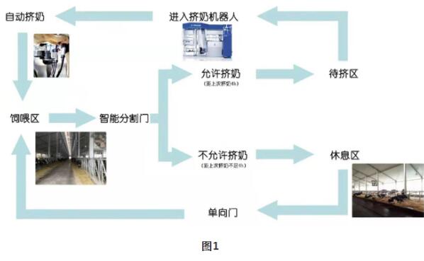 從圖1所示機器人擠奶流程可以看到,和奶廳擠奶存在區(qū)別。奶牛從休息區(qū)先通過單向門進入飼喂區(qū),在飼喂區(qū)進行采食,采食后通過智能分隔門,被允許擠奶的奶牛進入待擠區(qū),不被允許擠奶的奶牛依然回到休息區(qū),而擠完奶的這部分奶?;氐斤曃箙^(qū),再通過智能分隔門回到休息區(qū)。