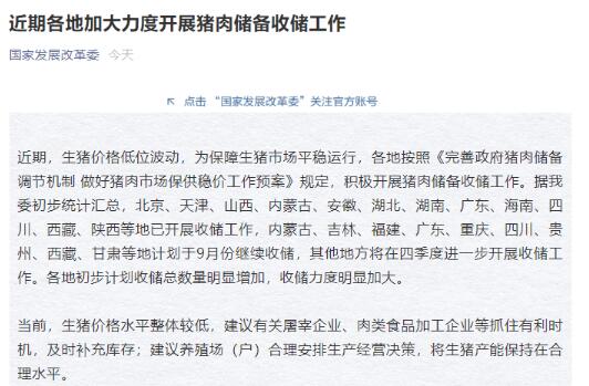 近期,生豬價(jià)格低位波動(dòng),為保障生豬市場平穩(wěn)運(yùn)行,各地按照《完善政府豬肉儲(chǔ)備調(diào)節(jié)機(jī)制 做好豬肉市場保供穩(wěn)價(jià)工作預(yù)案》規(guī)定,積極開展豬肉儲(chǔ)備收儲(chǔ)工作。據(jù)我委初步統(tǒng)計(jì)匯總,北京、天津、山西、內(nèi)蒙古、安徽、湖北、湖南、廣東、海南、四川、西藏、陜西等地已開展收儲(chǔ)工作,內(nèi)蒙古、吉林、福建、廣東、重慶、四川、貴州、西藏、甘肅等地計(jì)劃于9月份繼續(xù)收儲(chǔ),其他地方將在四季度進(jìn)一步開展收儲(chǔ)工作。各地初步計(jì)劃收儲(chǔ)總數(shù)量明顯增加,收儲(chǔ)力度明顯加大。