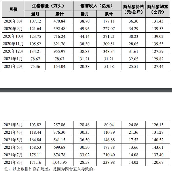 2021年1-8月,公司累計(jì)銷售生豬1,045.95萬(wàn)頭,同比增長(zhǎng)122.14%;累計(jì)銷售收入238.98億元,同比增長(zhǎng)34.93%。