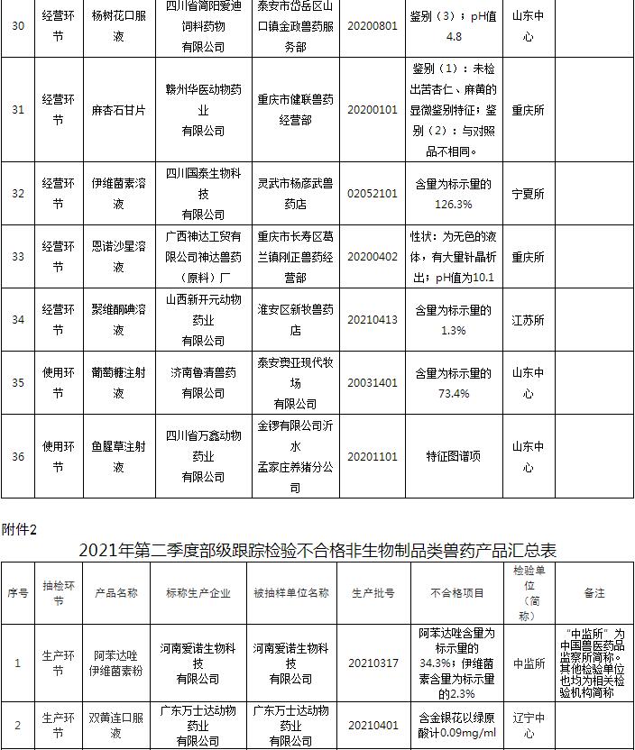 2. 2021年第二季度部級跟蹤抽檢不合格非生物制品類獸藥產品匯總表