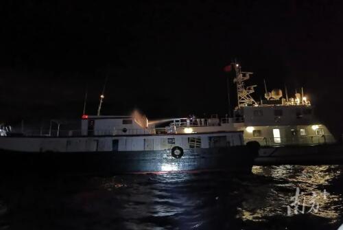 巡查中,執(zhí)法人員仔細查看海上往來船舶,通過漁船指揮系統(tǒng)辨別海上漁船信息。22日約19時30分,執(zhí)法人員綜合情報線索,發(fā)現(xiàn)深汕特別合作區(qū)對開海域有可疑船只,立即駕駛執(zhí)法船趕往該海域,發(fā)現(xiàn)無船名船號中型船舶1艘、小型快艇1艘,兩船形跡可疑,涉嫌走私。執(zhí)法船立即駛近查看,要求2艘船艇立即停船接受檢查。船上人員見狀立即跳上小艇棄船逃竄。執(zhí)法人員登船檢查,查獲走私凍品一批,并做好取證工作。同時發(fā)現(xiàn)機艙內(nèi)冒出黑煙,立即采取應急措施,撲滅艙內(nèi)明火,檢查船舶動力設備,順利保存好涉案物品。