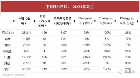 8月份,從厄瓜多爾的進(jìn)口量同比增長(zhǎng)59%,達(dá)到26200噸,而從印度的進(jìn)口量同比增長(zhǎng)216%,達(dá)到1.7萬(wàn)噸。