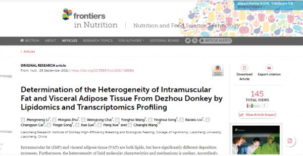 近日,聊城大學(xué)毛驢高效繁育與生態(tài)飼養(yǎng)研究院王長(zhǎng)法教授團(tuán)隊(duì)在國(guó)際營(yíng)養(yǎng)研究領(lǐng)域雜志《Frontiers in Nutrition》(IF2020=6.576,JCR分區(qū)Q1)在線發(fā)表了題為“Determination of the heterogeneity of intramuscular fat and visceral adipose tissue from Dezhou donkey by lipidomics and transcriptomics profiling”的研究論文。該研究在脂質(zhì)分子及其代謝特征上解析了驢肉脂質(zhì)組成(“脂質(zhì)譜”),為清晰認(rèn)識(shí)驢肉營(yíng)養(yǎng)價(jià)值和提高肌內(nèi)沉脂提供了新的視角。