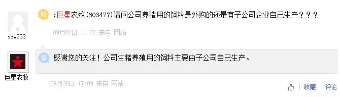 巨星農(nóng)牧近日在投資者互動平臺上表示,公司生豬養(yǎng)殖用的飼料主要由子公司自己生產(chǎn)。