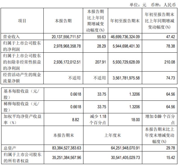 其中,公司7-9月實現(xiàn)營業(yè)收入201.38億元,同比增長55.63%;實現(xiàn)歸屬于上市公司股東的凈利潤29.79億元,同比增長28.29%;基本每股收益0.66元。