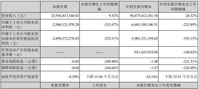 新希望10月30日發(fā)布了第三季度業(yè)績公告。公司第三季度實現(xiàn)營業(yè)收入329.57億元,同比增長9.52%;歸屬于上市公司股東的凈利潤為虧損29.86億元,同比下降255.47%。公司前三季度實現(xiàn)營業(yè)收入944.75億元,同比增長26.32%;歸屬于上市公司股東的凈利潤為虧損64.01億元,同比減少225.89%。