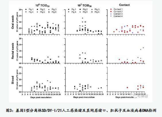 動(dòng)物試驗(yàn)表明,SD/DY-I/21感染豬表現(xiàn)為低致病力,具有高效傳播能力,可引起壞死性皮膚損傷和關(guān)節(jié)腫脹等慢性臨床癥狀(表1和圖2)。以106TCID50劑量感染6頭SPF豬,感染后第3天起陸續(xù)出現(xiàn)不同程度的間歇性發(fā)熱;第11天起3頭豬頸、耳部皮膚出現(xiàn)丘疹并發(fā)展為后腹部和全身性丘疹;第13天陸續(xù)出現(xiàn)關(guān)節(jié)炎,其中2頭豬發(fā)展到跛行(表1);感染后第5天起口拭子檢出病毒DNA,第7天起肛拭子與血液中檢出病毒DNA(圖3);感染后28天觀察期內(nèi)所有豬存活。以103TCID50劑量感染6頭SPF豬,感染后第3天起陸續(xù)出現(xiàn)間歇發(fā)熱,第13天有3頭豬出現(xiàn)皮膚丘疹;第14天陸續(xù)有5頭出現(xiàn)關(guān)節(jié)炎;第16天一頭豬發(fā)病死亡,其余28天觀察期內(nèi)存活(表1);口拭子、肛拭子和血液分別于感染后第9、第11和第7天檢出病毒DNA(圖3);檢測組織中的病毒載量,病死豬顯著高于安樂死存活豬;所有存活豬的組織均檢出病毒DNA,其中脾臟、肺臟、腎上腺、骨髓和某些淋巴結(jié)中病毒DNA載量較高。