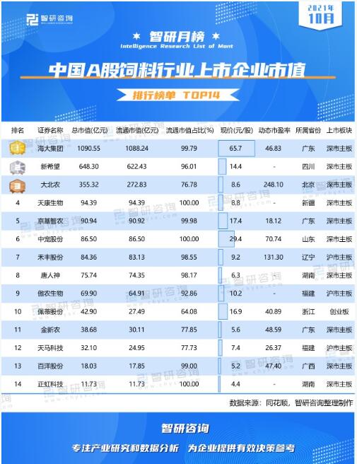 海大集團以超1000億元的總市值穩(wěn)居榜首,是一家涵蓋飼料、種苗、生物制藥、智慧養(yǎng)殖、食品流通、金融等全產業(yè)鏈的高新農牧企業(yè)集團;新希望總市值為648.30億元,排名第2,是一家農業(yè)產業(yè)化國家級重點龍頭企業(yè),也是我國最大的飼料生產企業(yè);大北農總市值355.32億元,排名第3,其他11家企業(yè)總市值均不足100億元,總市值最低的正虹科技僅11.73億元,是我國飼料行業(yè)中最早改制上市的股份制企業(yè)。