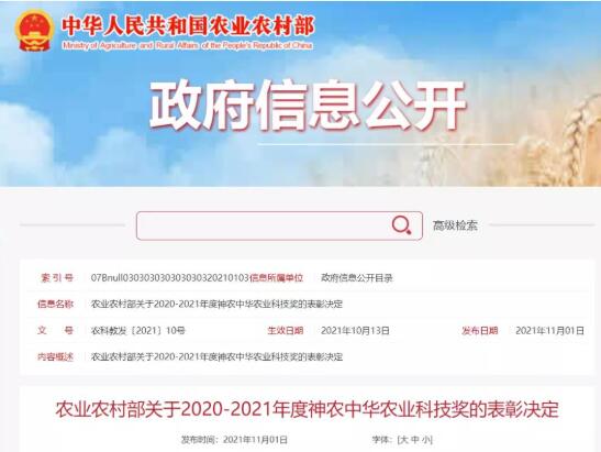 在農(nóng)業(yè)農(nóng)村部官網(wǎng)2021年11月1日發(fā)布的“關(guān)于2020-2021年度神農(nóng)中華農(nóng)業(yè)科技獎的表彰決定”中,公布了2020-2021年度神農(nóng)中華農(nóng)業(yè)科技獎獲獎結(jié)果,授予42項、47項、60項科研成果分別為科研成果一等獎、二等獎、三等獎,授予26個團(tuán)隊優(yōu)秀創(chuàng)新團(tuán)隊獎,授予14項成果神農(nóng)獎科學(xué)普及獎。