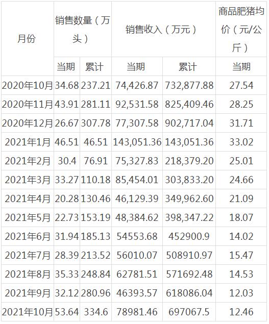 2021年1-10月銷售商品豬334.60萬(wàn)頭(其中仔豬銷售51.65萬(wàn)頭),銷售收入697,067.50萬(wàn)元,銷售均價(jià)18.96元/公斤(商品肥豬均價(jià)為17.66元/公斤),同比變動(dòng)分別為41.06%、-4.89%、-65.49%。