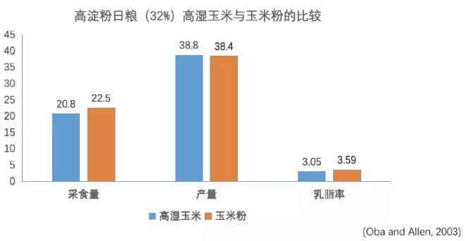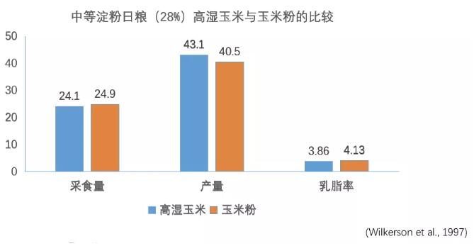 圖10所示為1997年的研究,使用中等淀粉日糧(28%)考察高濕玉米和玉米粉對(duì)采食量、產(chǎn)量及牛奶指標(biāo)(乳脂率)的差異??梢钥闯?,采食量沒有明顯下降,分別是24.9kg和24.1kg。但產(chǎn)量顯著提高,使用玉米粉配方產(chǎn)量是40.5kg,換成高濕玉米配方產(chǎn)量達(dá)43.1kg,增加了2.6kg。乳脂率由4.13%下降到3.86%,也不算特別大差異,這個(gè)配方是使用較成功的。因?yàn)榕浞降矸鄄皇翘貏e充足,或者因?yàn)榱鑫缚山到獾矸鄄蛔?,增加高濕玉米替代玉米粉,效果非常好?br>