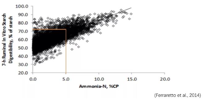 高濕玉米發(fā)酵產(chǎn)酸,酸解醇溶蛋白,因此,我們可以檢測到玉米蛋白可溶性的提高或者氨態(tài)氮含量的提高,氨態(tài)氮含量提高必然跟淀粉消化率有相關(guān)性,2014年的研究充分證明了這一點(diǎn),如圖2紅線標(biāo)示,蛋白中5%是氨態(tài)氮,所對(duì)應(yīng)的7小時(shí)瘤胃體外消化率能達(dá)72%左右。所以,高濕玉米要求有一定含量的氨態(tài)氮,如果氨態(tài)氮含量低至2-3%,那么它所對(duì)應(yīng)的淀粉消化率降到50-60%,就稱不上高濕玉米了,達(dá)不到我們利用高濕玉米提高淀粉消化率的目的。所以,對(duì)于高濕玉米尤其是市場化的高濕玉米來說,如何檢測它的質(zhì)量,能否達(dá)到應(yīng)有目的,要看其氨態(tài)氮水平,一般來說達(dá)到5%以上淀粉消化率是有保障的。