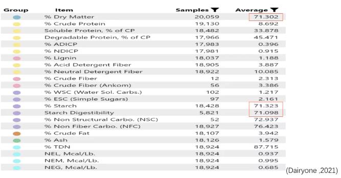 美國高濕玉米水平可從圖1 DairyOne實(shí)驗(yàn)室數(shù)據(jù)看出。2004年到2021年,DairyOne實(shí)驗(yàn)室一共檢測了大概2萬個(gè)高濕玉米樣品,2萬個(gè)數(shù)據(jù)平均下來,干物質(zhì)、淀粉含量、淀粉消化率(指7小時(shí)瘤胃體外消化率)都在71%左右。