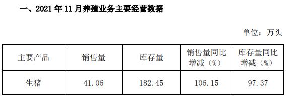 2021年11月,公司生豬銷售量41.06萬頭,銷售量環(huán)比增長11.84%,同比增長106.15%。
