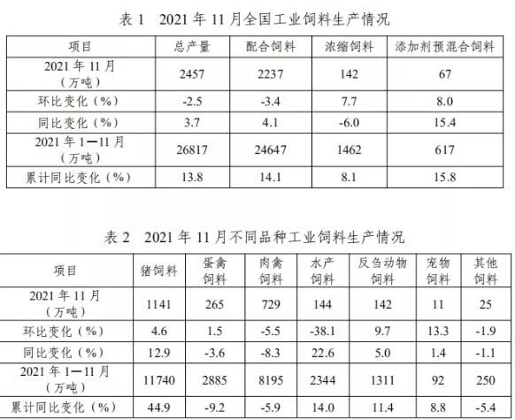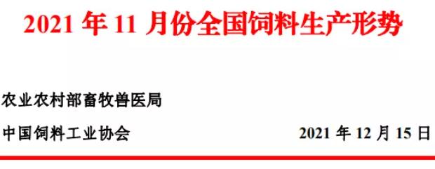 據(jù)樣本企業(yè)數(shù)據(jù)測算,2021年11月,全國工業(yè)飼料總產(chǎn)量2457萬噸,環(huán)比下降2.5%,同比增長3.7%。從品種看,豬飼料產(chǎn)量1141萬噸,環(huán)比增長4.6%,同比增長12.9%;蛋禽飼料產(chǎn)量265萬噸,環(huán)比增長1.5%,同比下降3.6%;肉禽飼料產(chǎn)量729萬噸,環(huán)比下降5.5%,同比下降8.3%;水產(chǎn)飼料產(chǎn)量144萬噸,環(huán)比下降38.1%,同比增長22.6%;反芻動物飼料產(chǎn)量142萬噸,環(huán)比增長9.7%,同比增長5.0%。