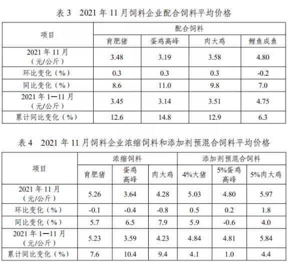 2021年11月,主要配合飼料、添加劑預(yù)混合飼料產(chǎn)品出廠價格環(huán)比穩(wěn)中小幅增長,主要濃縮飼料產(chǎn)品出廠價格環(huán)比下降。由于主要原料價格與去年同期相比仍處高位,推動產(chǎn)品出廠價格同比繼續(xù)增長。