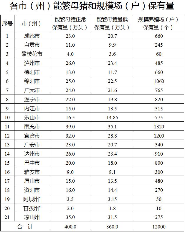 按照農(nóng)業(yè)農(nóng)村部《生豬產(chǎn)能調(diào)控實(shí)施方案(暫行)》要求,結(jié)合《四川省“十四五”推進(jìn)農(nóng)業(yè)農(nóng)村現(xiàn)代化規(guī)劃》,設(shè)定我省能繁母豬存欄量調(diào)控目標(biāo),即能繁母豬正常保有量穩(wěn)定在400萬頭左右,最低保有量不低于360萬頭。結(jié)合各市(州)產(chǎn)業(yè)發(fā)展布局重點(diǎn),確定能繁母豬正常保有量(附件1);以能繁母豬正常保有量的90%為標(biāo)準(zhǔn),確定最低保有量。各市(州)能繁母豬月度存欄量以國家統(tǒng)計(jì)局季度數(shù)據(jù)為基數(shù),根據(jù)農(nóng)業(yè)農(nóng)村部養(yǎng)殖場(chǎng)直聯(lián)直報(bào)系統(tǒng)監(jiān)測(cè)數(shù)據(jù)測(cè)算得出。(農(nóng)業(yè)農(nóng)村廳負(fù)責(zé))